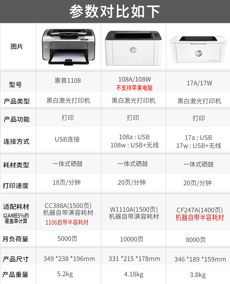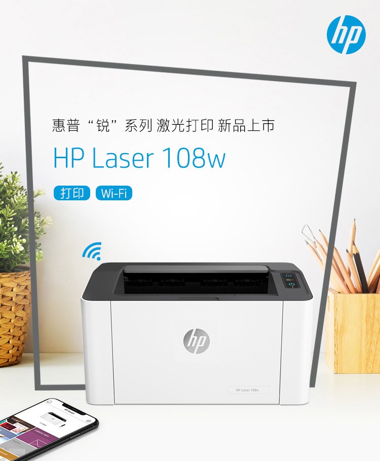 惠普(HP)1108/17w/108w/108a/104a A4黑白激光打印機(jī)家用小型辦公同1020 108w(1108升級(jí)版無線+滿容耗材)